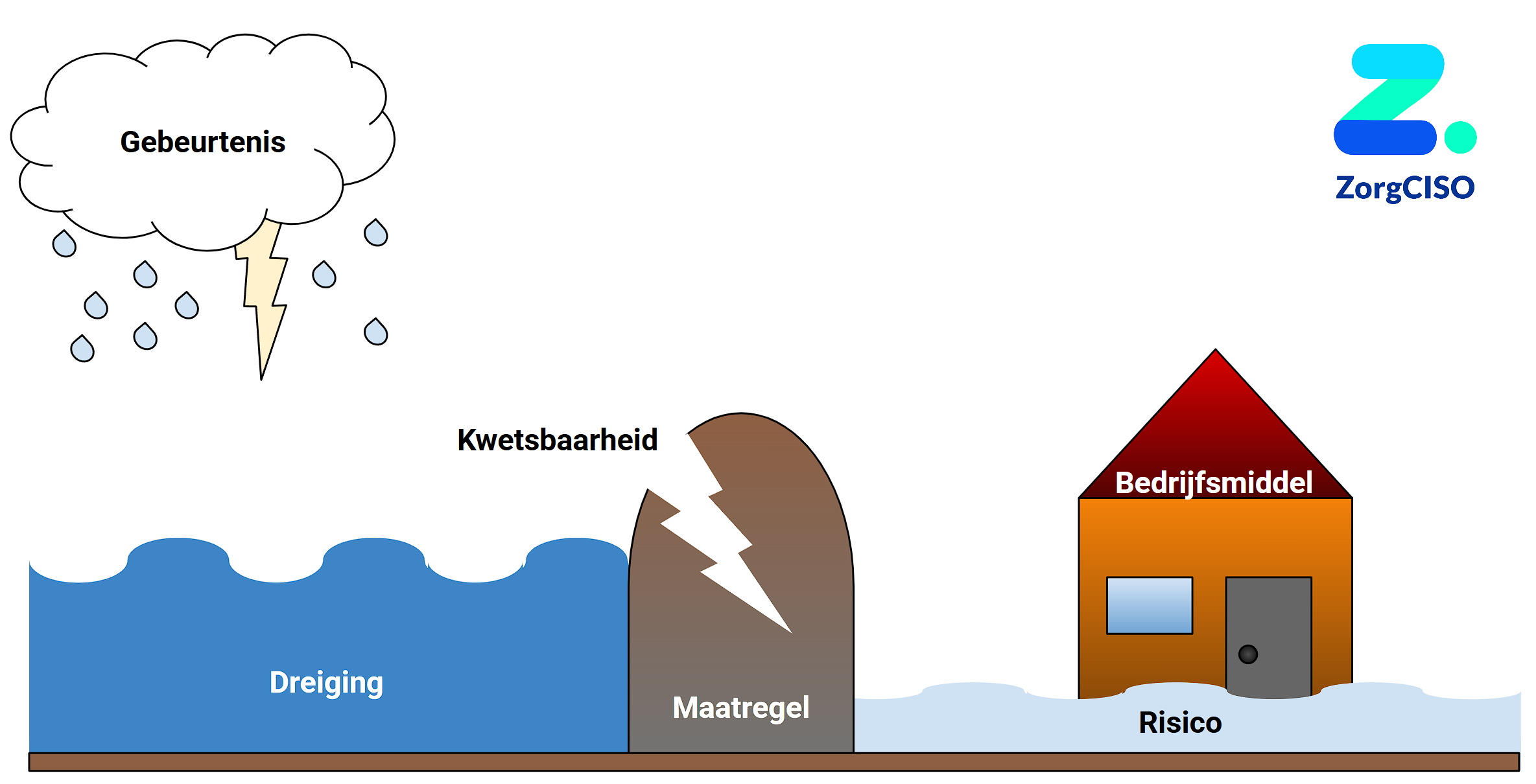 Bijvoorbeeld: scheuren in de dam. - Het risico is de denkbeeldige uitkomst van kans van optreden maal impact van optreden van een dreiging. Vaak geduid als een score (bv. “12”) of niveau (bv. “hoog”).